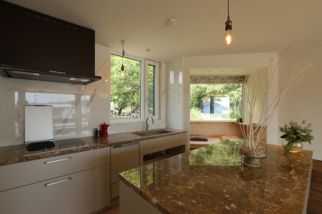 オリジナルの天然大理石キッチン ガゲナウの2口ih グリルの組み合わせ キッチン横のカウチスペース 奥様くつろぎの空間 カウンターも設けて より使いやすいように 借景の窓 下部スペースを床下エアコンに利用 Ih グリル キッチン リビング キッチン